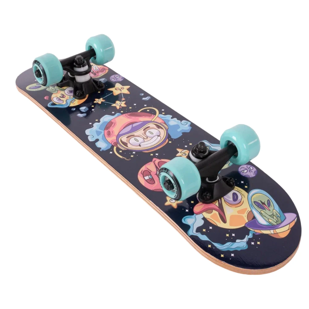 Яркий дизайн делает эту модель неповторимой: нижняя часть деки украшена крутым принтом в голубых тонах с изображением космоса и инопланетян. Это не просто товары для спорта, это - произведение искусства на колесах.