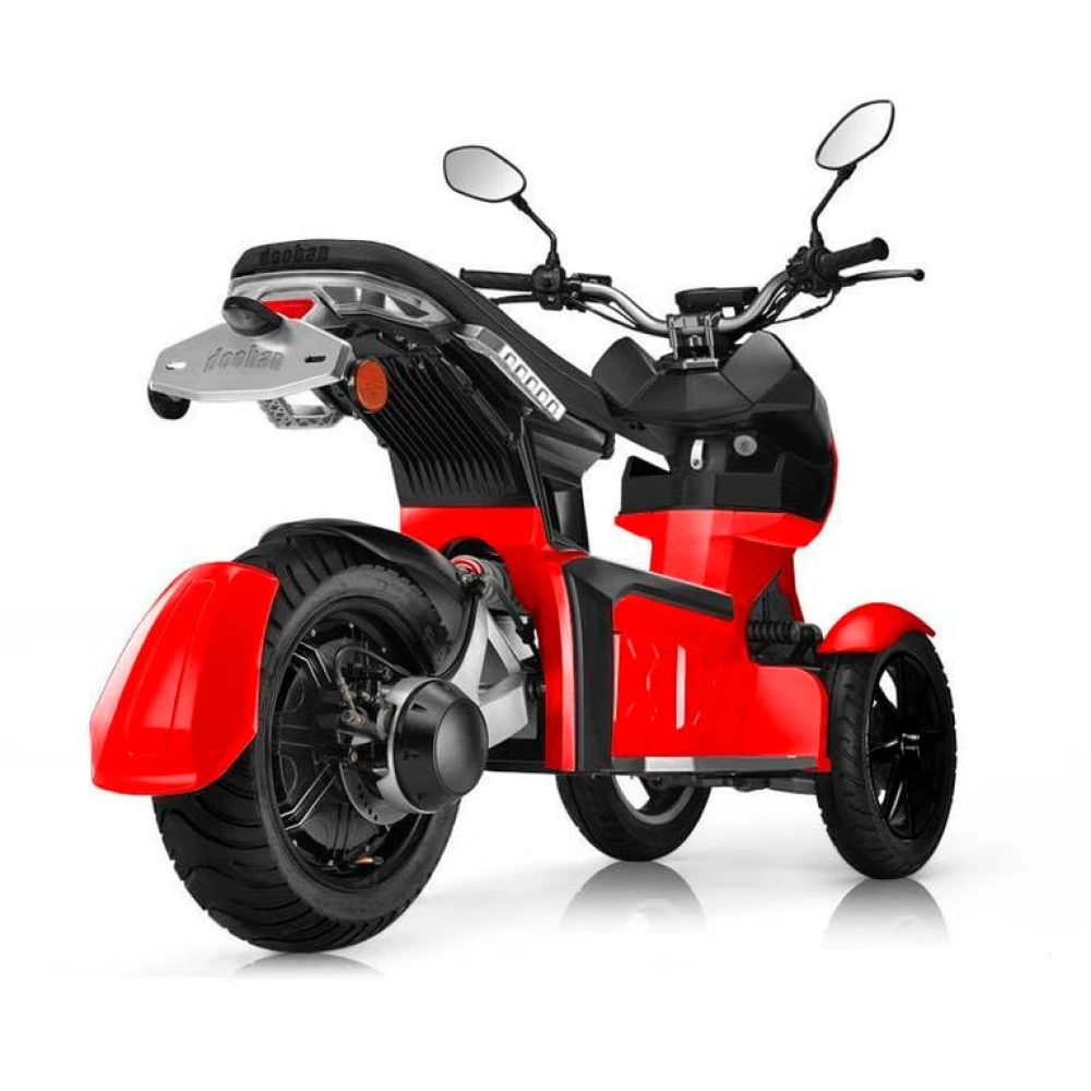 Электроскутер iTank Doohan EV3 Trike 1500W Красный 1 Аккумулятор 60V26Ah - универсальное и надежное средство передвижения. На нем одинаково комфортно перемещаться как в плотном городском трафике, так и в суровых условиях бездорожья. Быстрый и маневренный, он легко проезжает по узкой улице, грунтовой дороге или холмистой местности. Независимая подвеска переднего моста обеспечивает стабильность скутера во время резких маневров. Три пневматических колеса с глубоким протектором сохраняют отличное сцепление с поверхностью даже в негативных погодных условиях. Мощный двигатель обеспечивает быстрый и плавный разгон до 45 км/час. Емкости батареи хватает на преодоление 80 км пути. Аккумулятор полностью заряжается в течение семи часов от обычной розетки. Наличие ярких фар, поворотников и габаритных огней позволяет уверенно управлять транспортным средством даже в темное время суток. Бортовой компьютер транслирует на электронный дисплей основные параметры движения и уровень заряда батареи. Электроскутер iTank Doohan EV3 1500W отлично спроектирован и отличается ярким стильным дизайном. Красный цвет корпуса добавляет индивидуальности и выделяет данную модель в плотном потоке транспорта.