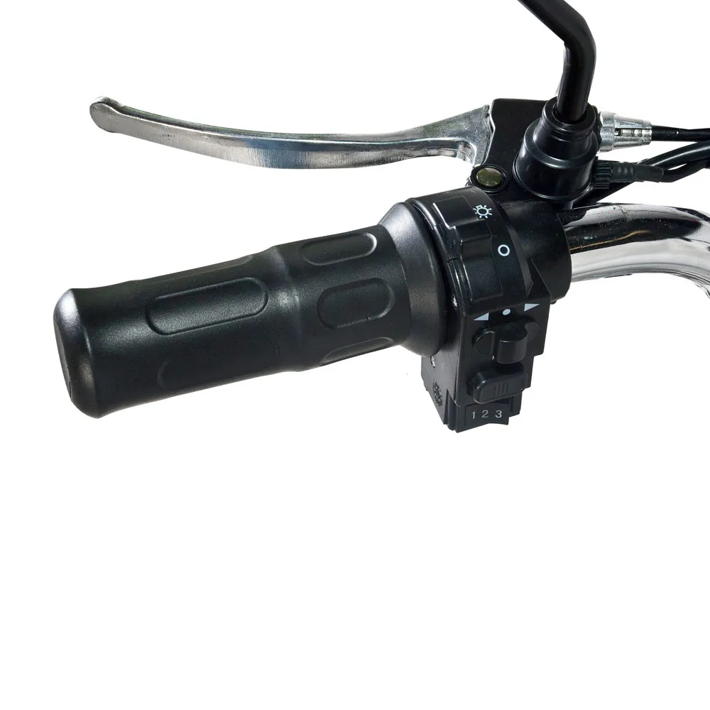 На руле велосипеда расположены ручки тормоза, ручка газа, бортовой компьютер и зеркала заднего вида.